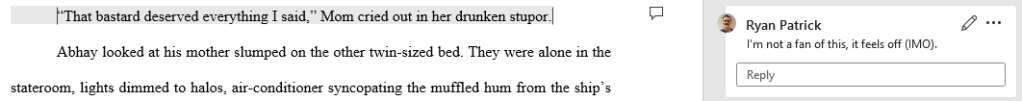 I see something – a line of dialog in this case – that I don’t feel like fits, and I call it out using Microsoft Word’s comment feature. I’m not telling the author how to fix it, or making any kind of personal attack on the writer or his/her work. Just that a sentence doesn’t work for me.