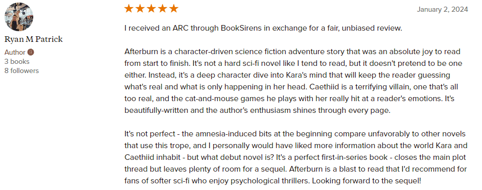 ARC (Advanced Review Copy) Reading is of a complete product that is going out for review, hopefully before publication. There should be no typos, plot holes, or anything that a paying customer would expect to see. The end result is a review that is posted to Amazon, Goodreads, or social media to help the author generate buzz prior to a release. Here’s an example of a book that I received an ARC of and reviewed on both Amazon and Goodreads (D. Andrew’s Afterburn, a fantastic sci-fi book):