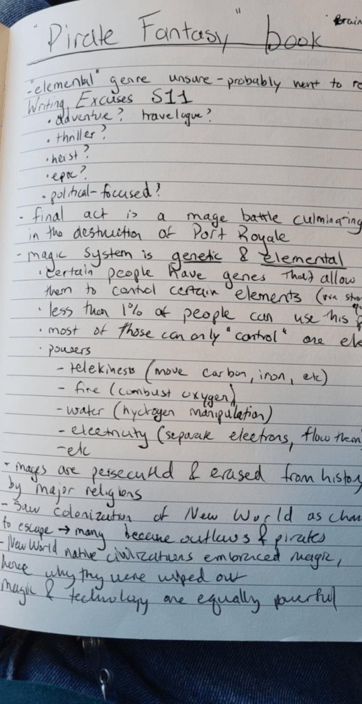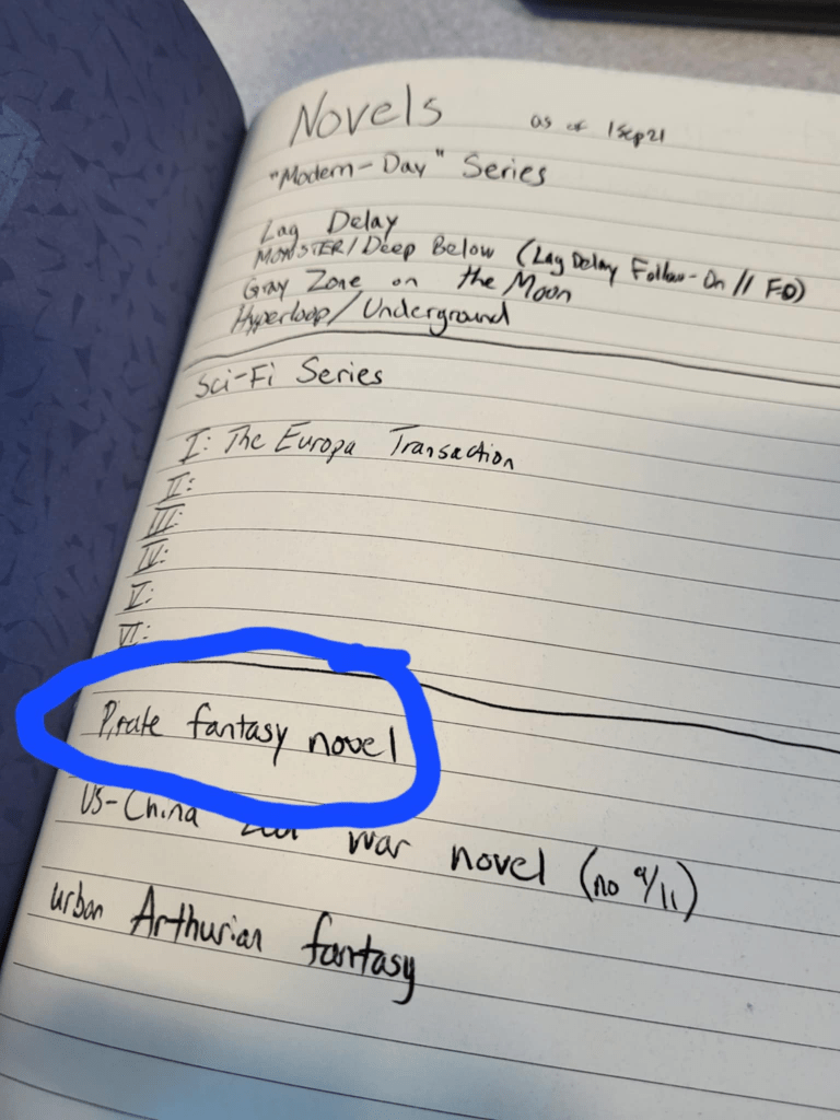 I started thinking way back in maybe 2018 or 2019 about a pirate fantasy novel, and looking at my writing notebook (which I’ll go more into detail in a different post about how I keep notes), there’s two words – “pirate fantasy” – before “novel,” meaning I always had this planned as a novel-length work.