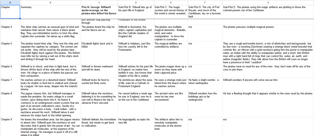 That didn’t make sense when I first heard it. A spreadsheet in Excel or Google Sheets is a 2-dimension database, usually used for finance or engineering – not writing. But, the more I thought about it, the more it sounds like a good idea. It would allow me to show how different arcs develop over the course of the book and to ensure that the different subplots get the correct amount of time on the page.