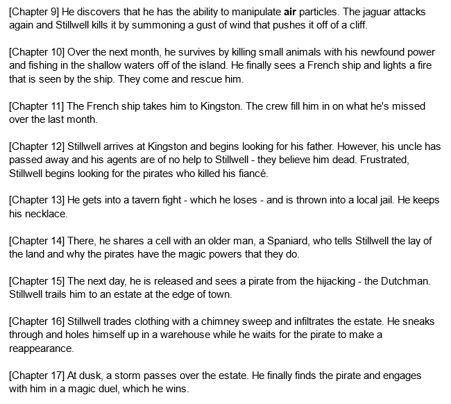 See how I added a prologue, and added plenty of characters and depth that weren’t in the original 3 paragraphs. I start with the main character and his fiance leaving England for the New World, only to get her killed by pirates as soon as they reach the Caribbean. I know “fridging” is a passe trope, but that’s only part of the protagonist’s motivation – his fortune that he is set to inherit is gone as well, stolen by the pirates. He then will hunt down three of the four pirate captains in sequence, slowly increasing his magical power, before engaging in a magic duel outside of Port Royale that causes the earthquake that destroyed the town in the historic record. No scenes, no chapters, just the overall high-level plan of each act. However, it does let me get the overall “shape” of the plot down and then I can fix the details later.