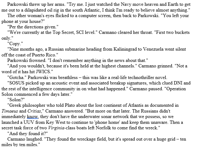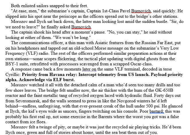 This is very similar to the prologue of the first draft and the first chapter of the last one. There’s two differences here – the Russian submarine Vepr is tailed by an American one (the USS Arizona, the primary setting of the last two attempts!) and it’s using quantum processing gear, rather than an active SIGINT method, to listen to telemetry from an American space launch. I also added more technical details per feedback from my readers (not my beta readers/author friends – their advice is the opposite of my paying customers).