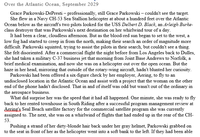 It’s similar to the opening of both Sphere and Deep Storm and until the end changed very little from the second version – which was 100% different from the first one. I introduce Grace Parkowski, the main character, I give her some character motivation, and I give lots of technical details to establish my bona fides as an expert in aerospace/military matters. I also moved the main events from April to September of 2029 to put it into hurricane season.