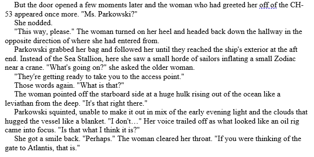 Chapter One: Grace Parkowski arrives on the USS Delbert D. Black and goes through a quick psychological and physical screen. Afterward, she sees the ship arrive at an oil rig off of the coast of Puerto Rico.