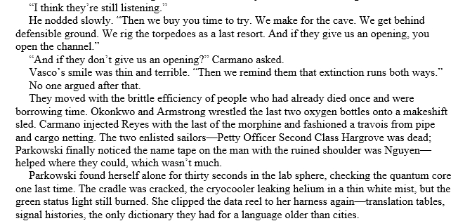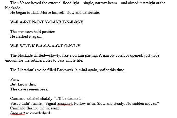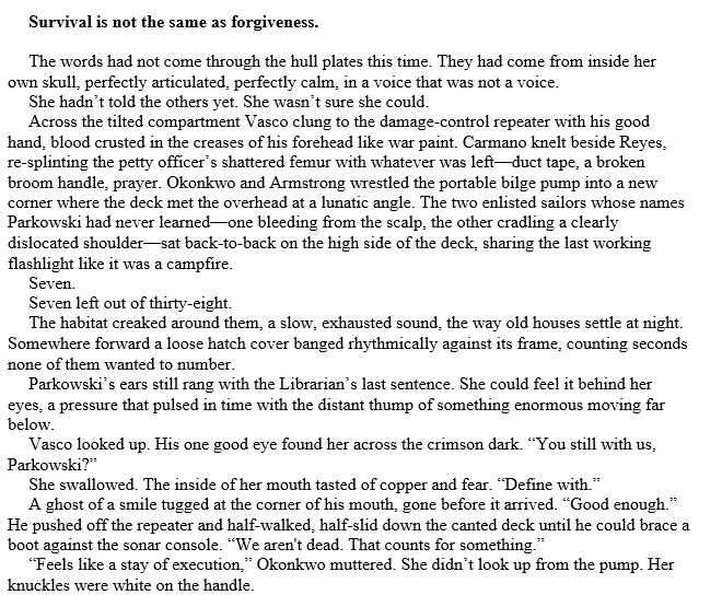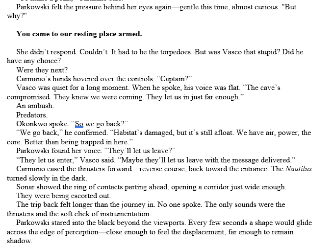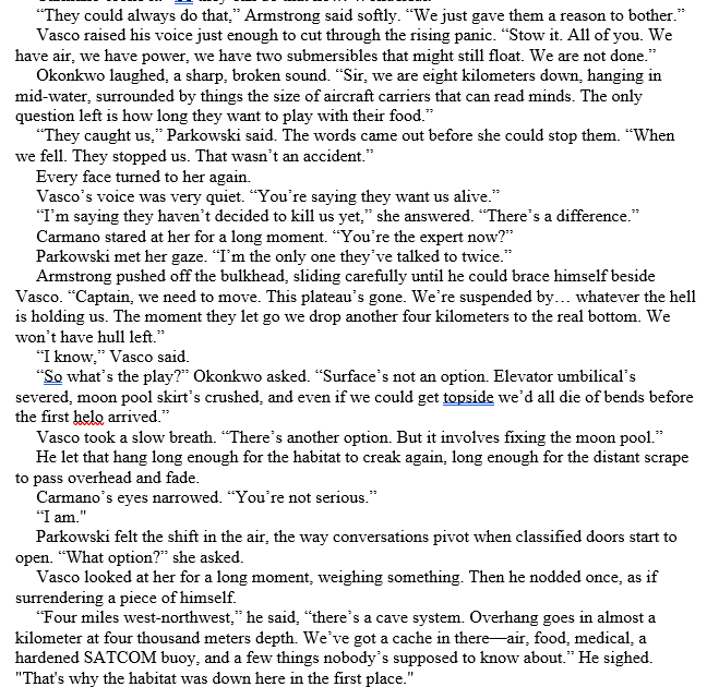 Chapter Thirty: Parkowski’s head is briefly probed by one of the beings – perhaps the Librarian, but she can’t be sure. The crew braces but however they don’t get another attack. Debates rage over evacuation. They decide again to use the submersibles to reach a safer depth in the caves, where the Navy was doing underwater testing of low-yield nuclear torpedoes – the original reason that the habitat was down here, finally revealed to Parkowski – where there are supplies, including air. End the discussion and chapter just before they go to board the submersibles.