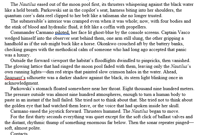 Chapter Thirty-One: They (Parkowski, Carmano, Vasco, Okonkwo – the others are on the Seaquest) leave the habitat, temporarily pausing as the contacts move, then stop again. Parkowski asks more questions about the nuclear torpedoes but is rebuffed. Some light discussion on the Nautilus about the creatures. They communicate with the other submersible (Seaquest) by shining lights back and forth in morse code. Sonar tracks multiple pursuers closing in.
