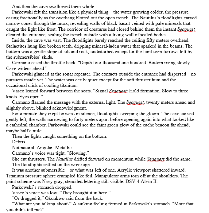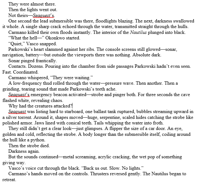 Chapter Thirty-Two: Start as soon as the last chapter ended (they entered the cave). The submersibles are ambushed – the creatures behave like predators, tossing their prey around. They still don’t get a good look at them. Seaquest is destroyed while the remaining survivors on Nautilus decide to head back to the habitat and abandon the caves.