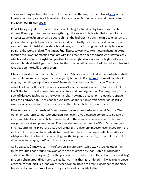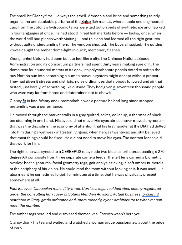 So, I’m obviously biased – I wrote this many moons ago. It’s not my best writing, but I think it’s clear as day that it’s got a soul to it that the AI-generated chapters lack. There’s little asides (old Pacific Rim slums) that give the text depth and the sensory details – taste, smell, touch, sight, hearing – aren’t overwhelmed; they’re instead spread out.