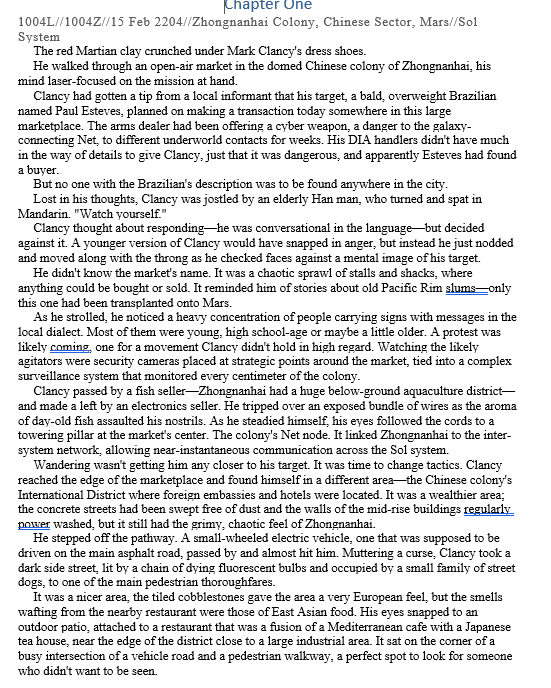 Write a suspenseful third-person opening chapter following Mark Clancy, a weary DIA covert operative and former F-77A Rapier pilot, as he tracks an arms dealer named Paul Esteves through the gritty, domed Martian colony of Zhongnanhai. The narrative should blend atmospheric world-building—from bustling fish markets to high-end international districts—with the use of high-tech espionage tools like rotor-blade drones and augmented reality contact lenses. Focus on a sequence where Clancy surreptitiously observes a tense meeting between criminal factions regarding a “Net” cyber weapon, only for the mission to be upended when an unexpected assassination of a local official occurs. Maintain a noir-inspired tone that balances Clancy’s professional calculations with brief, somber reflections on his past life and a lost loved one. Keep it between 2000 and 2500 words.