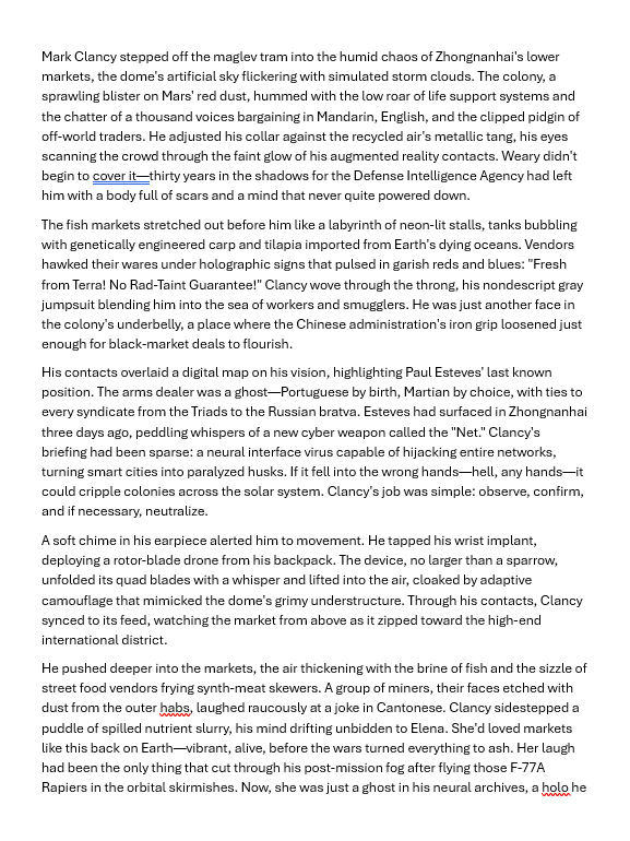 And this is with a clear, descriptive prompt that I backed out of my own human-generated chapter! If you told it something more generic “Write me a first chapter to a sci-fi espionage thriller novel set on a partially-colonized Mars” you’d get something even worse!